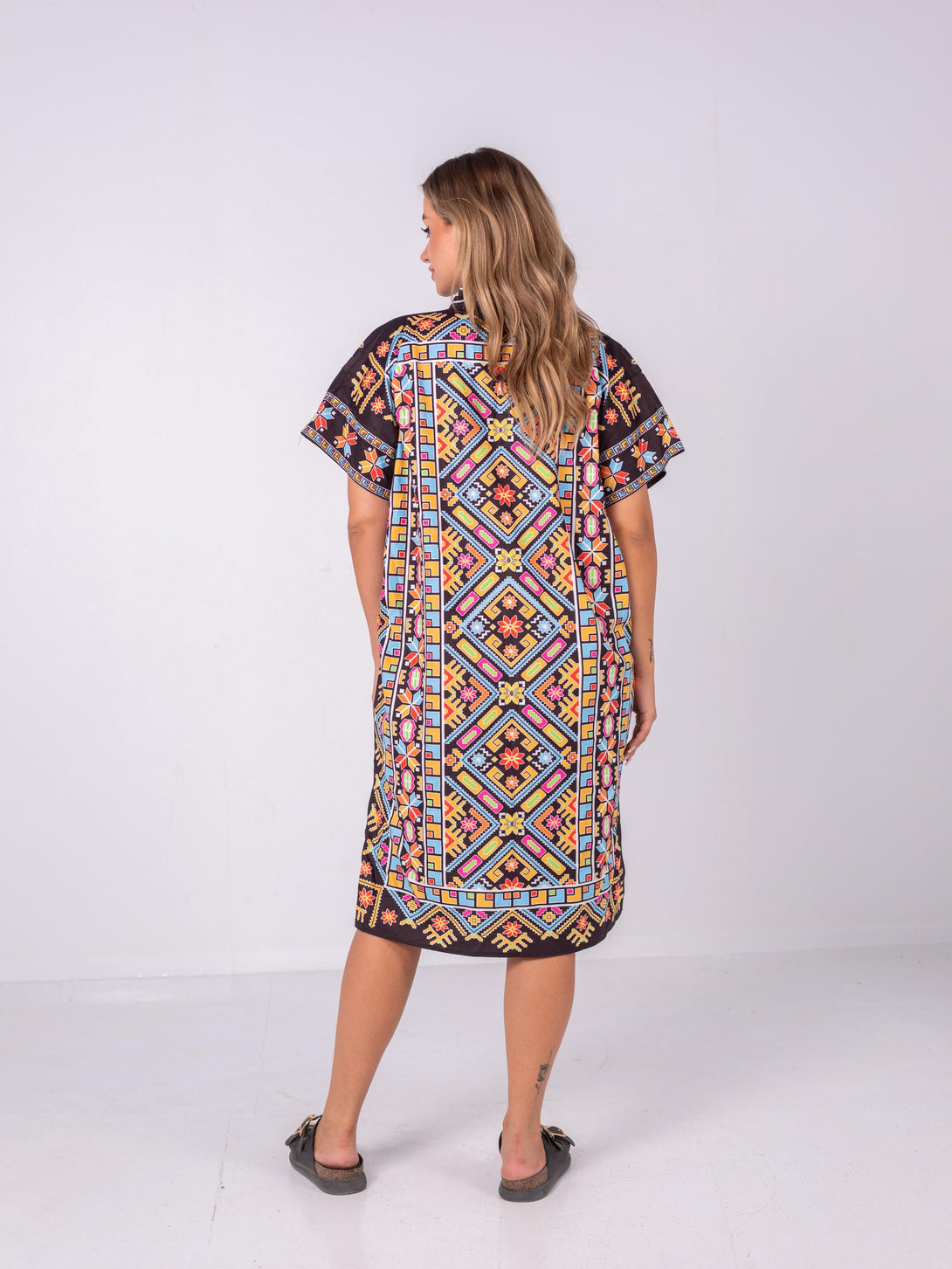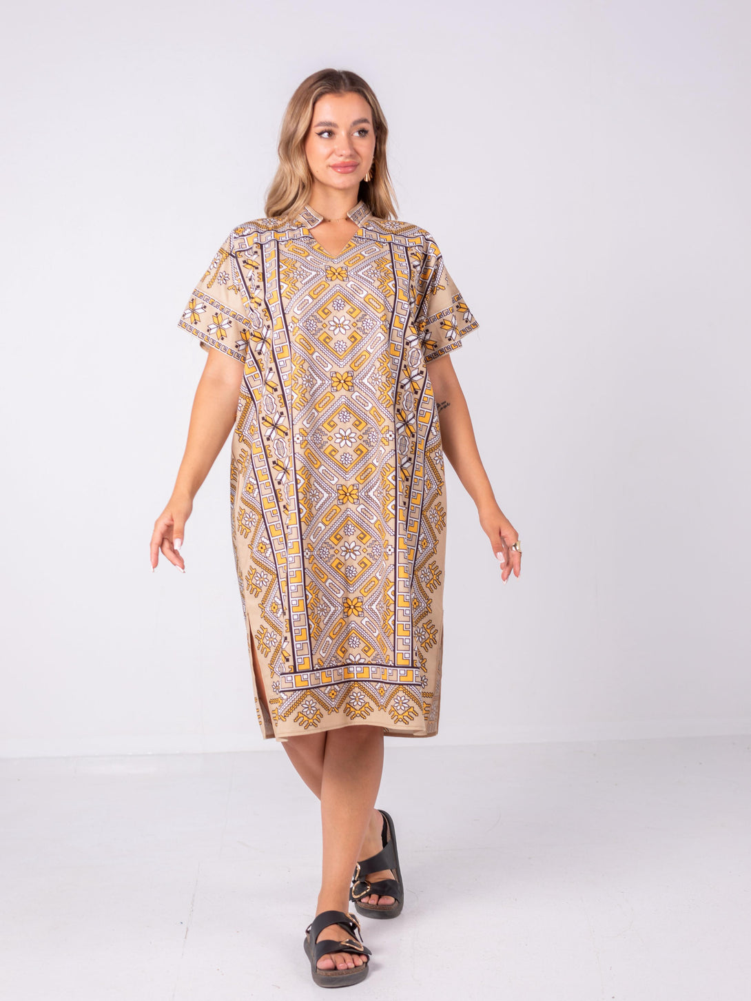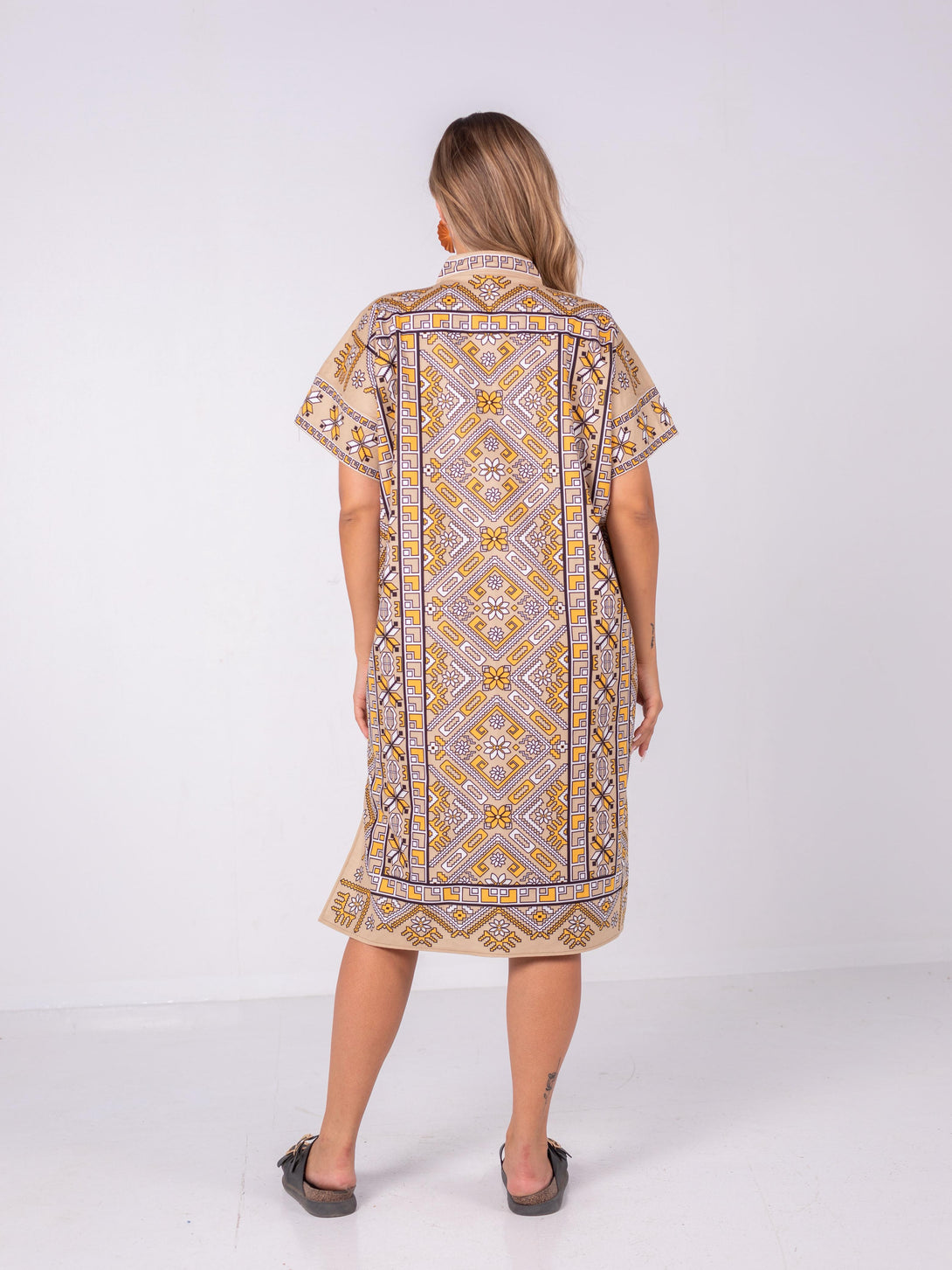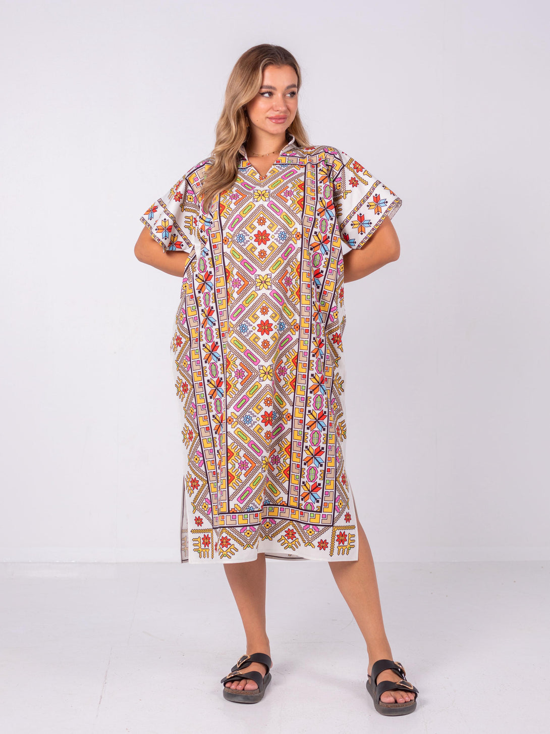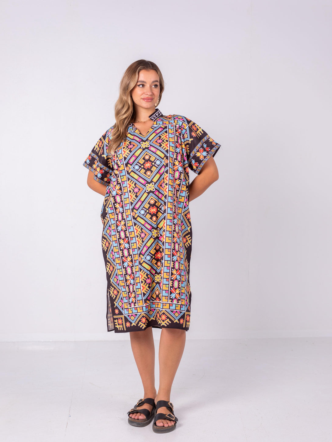 Bring stories of the desert into your wardrobe with this exquisitely detailed kaftan dress, designed for the woman who treasures comfort, culture, and individuality.